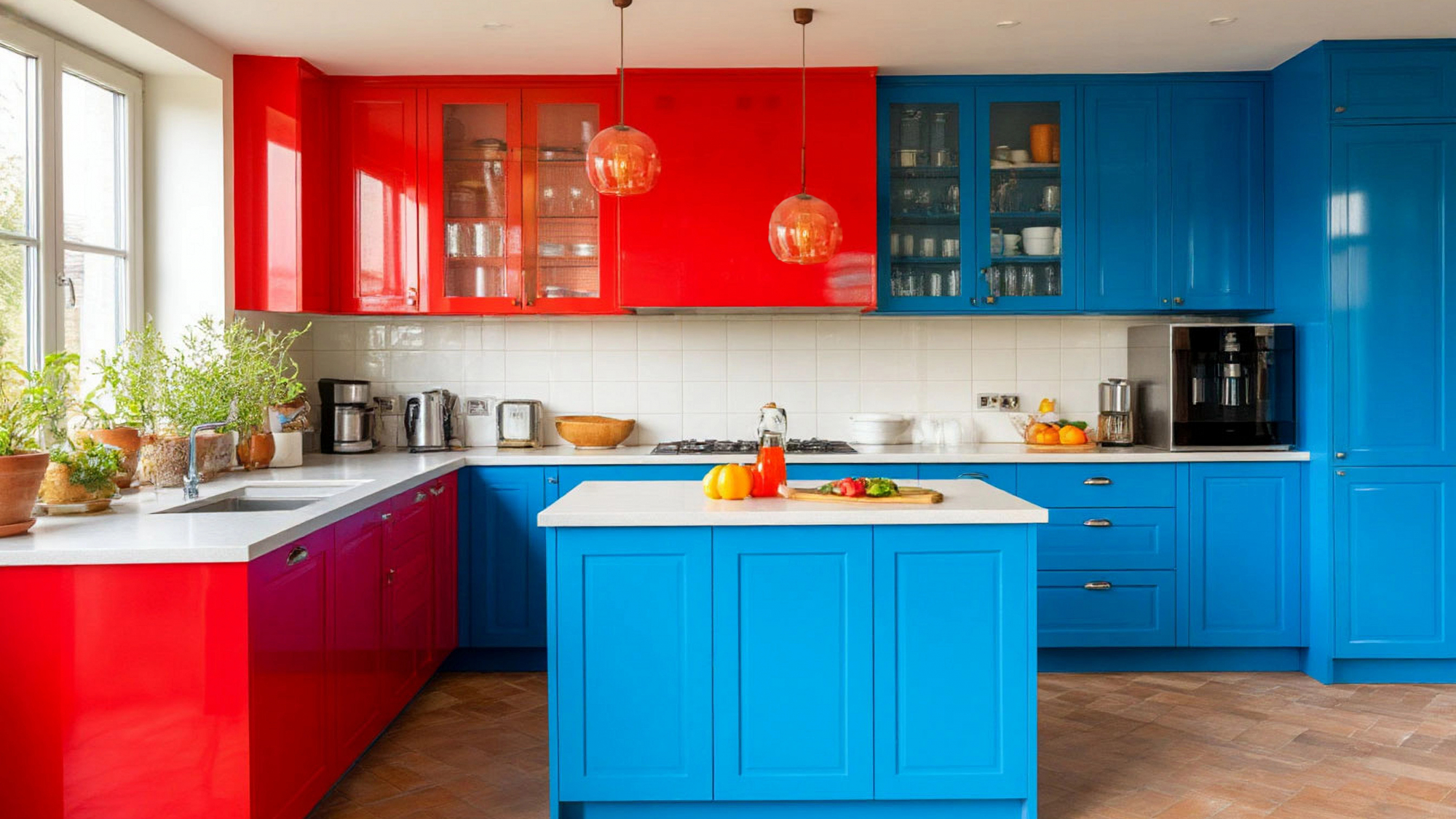 Фасады кухни выполнены в сочетании красного и синего цветов, гармонично вписанных в светлую основу интерьера. Такое смелое решение позволяет подчеркнуть индивидуальность пространства, создавая яркий акцент, который не перегружает общий интерьер. Красный оттенок добавляет тепла и энергии, в то время как синий приносит спокойствие и визуальную глубину. В результате кухня становится не только функциональным местом для приготовления пищи, но и выразительным декоративным элементом, который оживляет помещение и задаёт настроение всему дому.