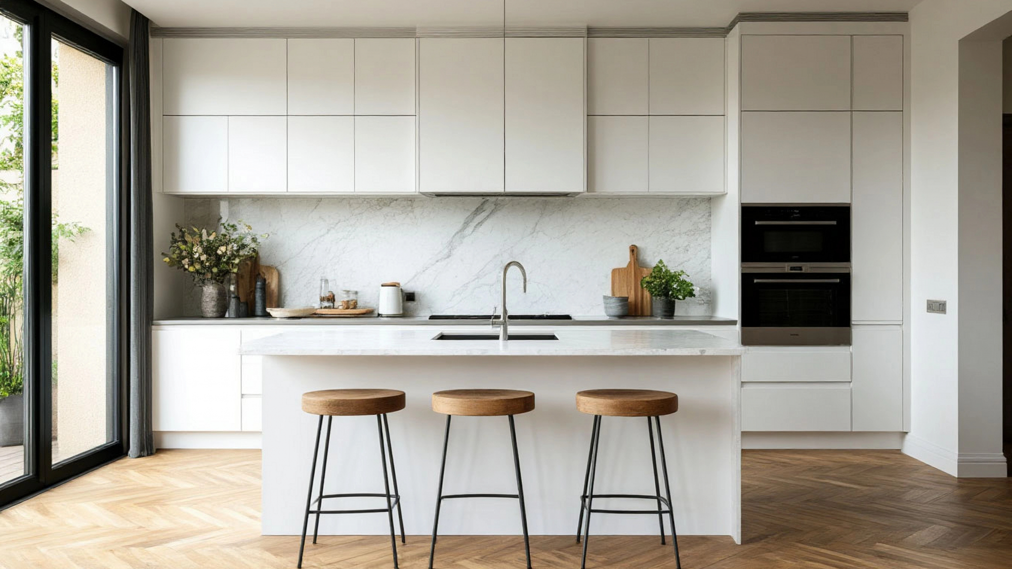 Фасады кухни выполнены из высококачественных материалов, обладающих прочностью и легкостью ухода. Белый цвет создаёт ощущение чистоты, спокойствия и гармонии, визуально увеличивает пространство и делает помещение более светлым даже при ограниченном естественном освещении. Матовые и глянцевые поверхности удачно комбинируются, подчеркивая современный характер кухни, а лаконичные ручки и незаметные элементы фурнитуры не отвлекают от общей концепции. Чистые линии фасадов, геометрическая точность и минимализм деталей создают современную эстетику, которая воспринимается как элегантность без лишних украшений.