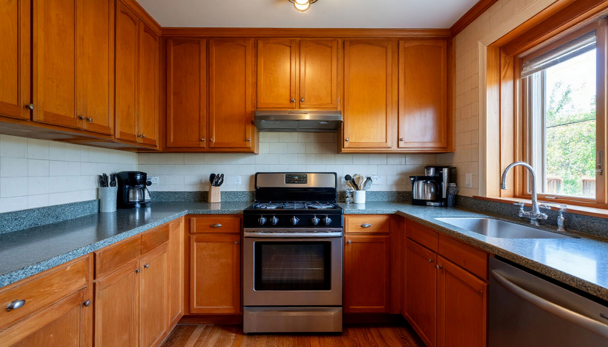 Материалы кухни не только эстетичны, но и практичны. Фасады легко очищаются от загрязнений, устойчивы к влаге и температурным перепадам. Столешницы из искусственного камня или ламинированного материала выдерживают активное использование, не теряя внешнего вида и долговечности. Фурнитура обеспечена системой плавного закрывания, которая повышает удобство и снижает риск повреждений.