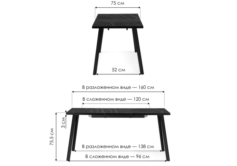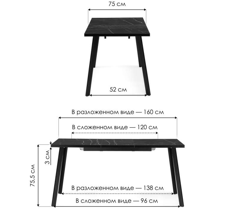 Расстояние между ножками: 96 - 138 х 52 см. Толщина столешницы: 3 см.