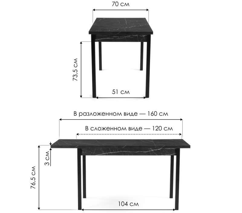 Расстояние между ножками: 104 х 51 см. Толщина столешницы: 3 см.