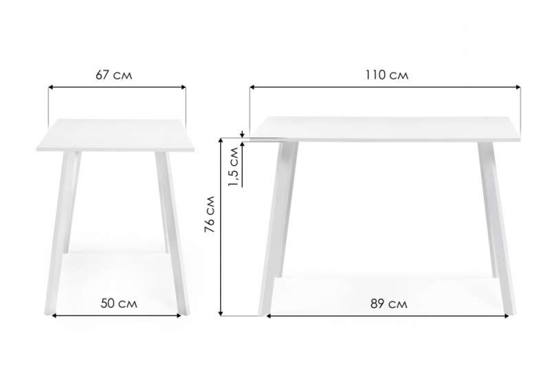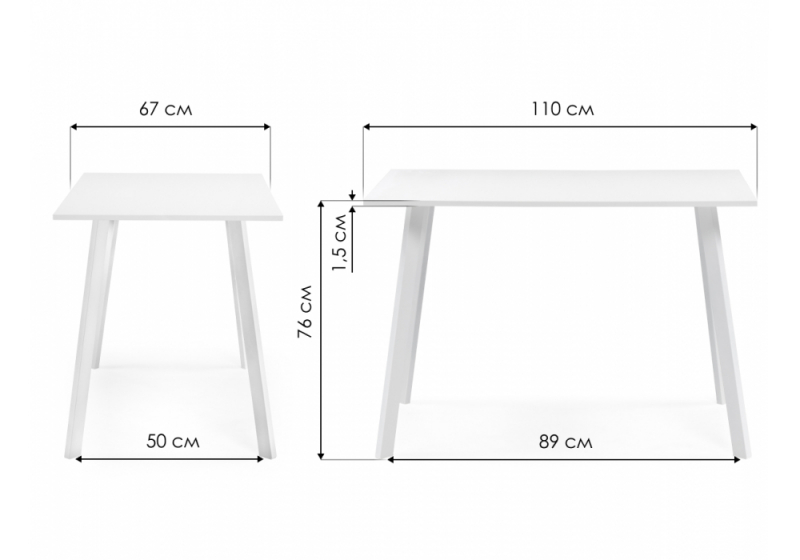 Расстояние между ножками: 89 х 50 см. Толщина столешницы: 1,5 см.