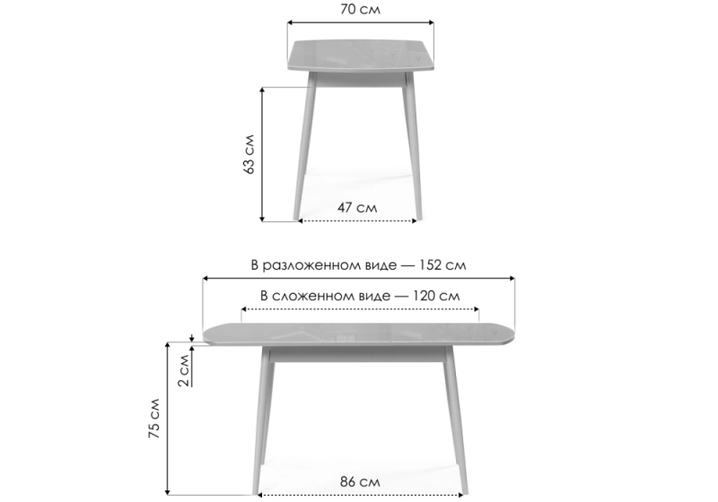 Расстояние между ножками: 86 - 47 см. Толщина столешницы: 2 см.